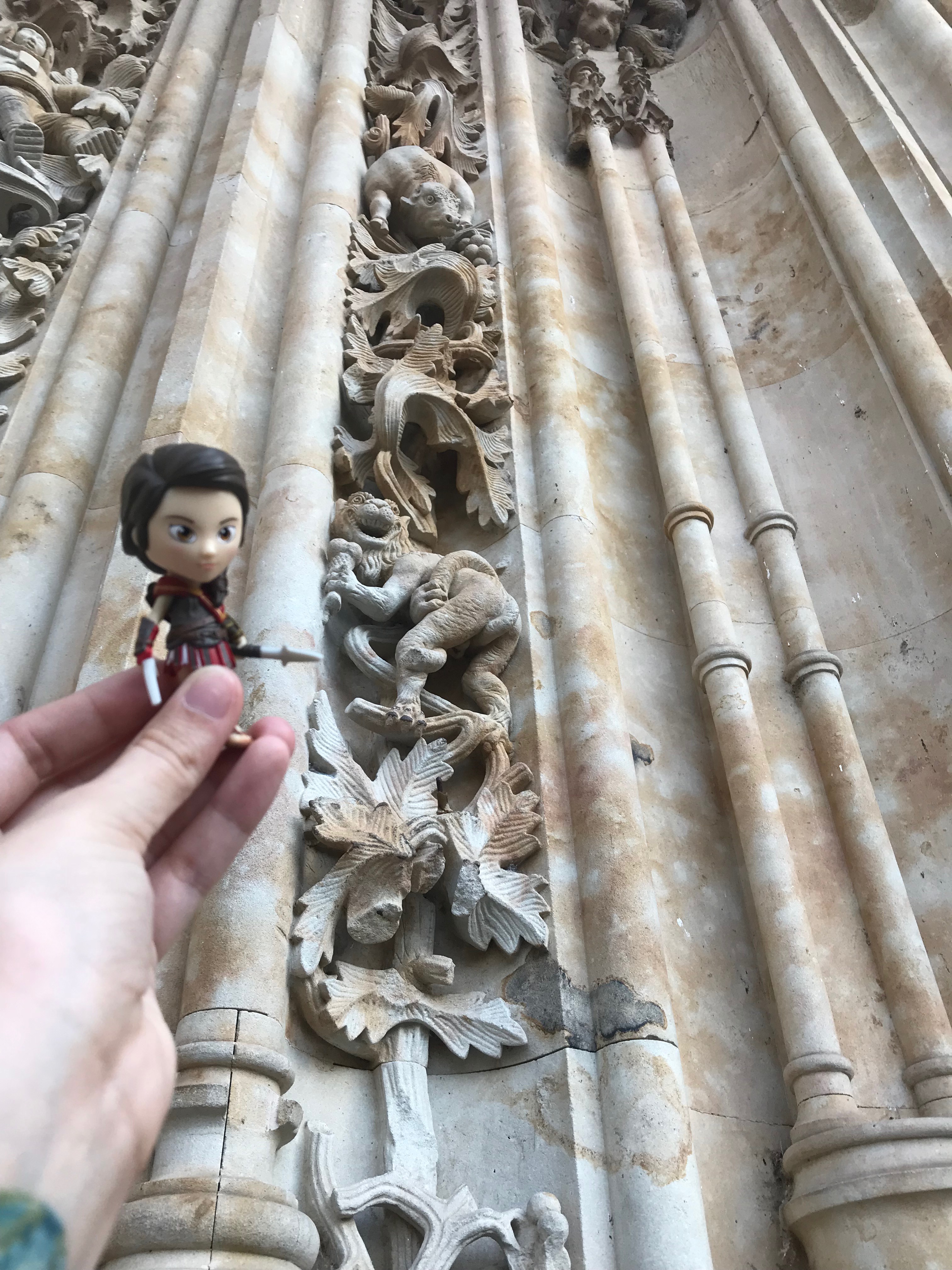 It was not long before a bilingual resident of Salamanca, Manuel, was able to provide the group with directions to “La Rana de Salamanca.” When we arrived at the designated location, I looked around in haste, hoping to find the frog before the other mercenaries. Working alone soon proved futile, so I called upon Kayla of Florida and the other group members to aid me in my search. Our quest was soon completed! Carved into part of an elaborate wall, the frog rested atop a skeleton’s head at the University of Salamanca.
